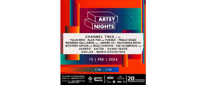Prepárate para embarcarte en una odisea sonora mientras Artsy Nights, en colaboración con el legendario Icon Ibiza, prepara el escenario para la celebración definitiva del 20 aniversario de ZⓈONAMACO, la feria de arte más destacada de América Latina. Entrégate a los electrizantes sets de un variado elenco, cada artista dispuesto a llevarte en un viaje musical fascinante.